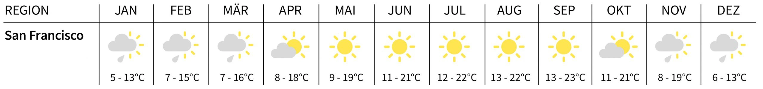 San Francisco ist die am nördlichsten gelegene Stadt Kaliforniens. Im Hochsommer werden es in dieser Küstenstadt etwa 25 Grad Celsius. Oft zieht am Ende des Tages Nebel durch die Stadt und dann kann es auf einmal stark abkühlen. Auch wenn Sie morgens mit kurzer Hose losziehen, sollten Sie einen warmen Fleecepullover für den Nachmittag mitnehmen.